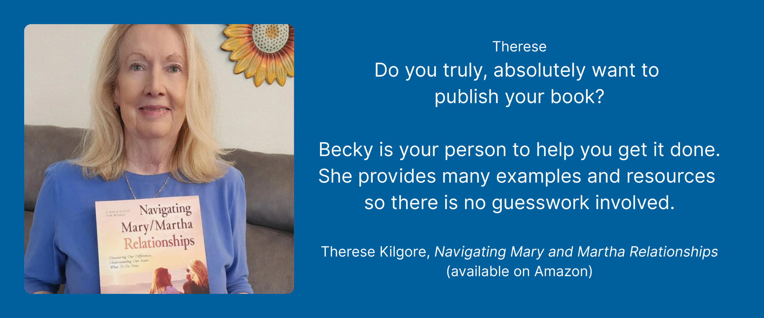 I am eternally grateful to God for sending Becky into my life at His appointed time. I joined FINISH! and because of Becky’s expertise, I did just that: Finished! She turned the heat up on my timeline, provided the tools, and walked with me across the finish line. I am a published author now because of Becky’s well-executed program.